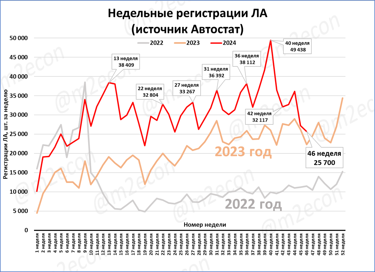 На 46-й неделе было зарегистрировано 25,7 тыс. легковых автомобилей (Автостат).