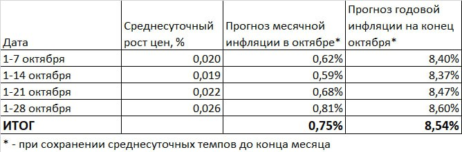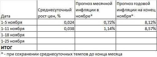 Если такой темп сохранится до конца месяца, то по итогам ноября годовой рост цен может составить 8,57% годовых. Это будет не снижение, а рост по сравнению с итогами октября (8,54%).