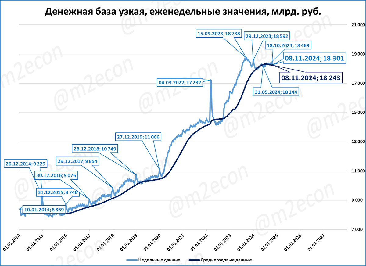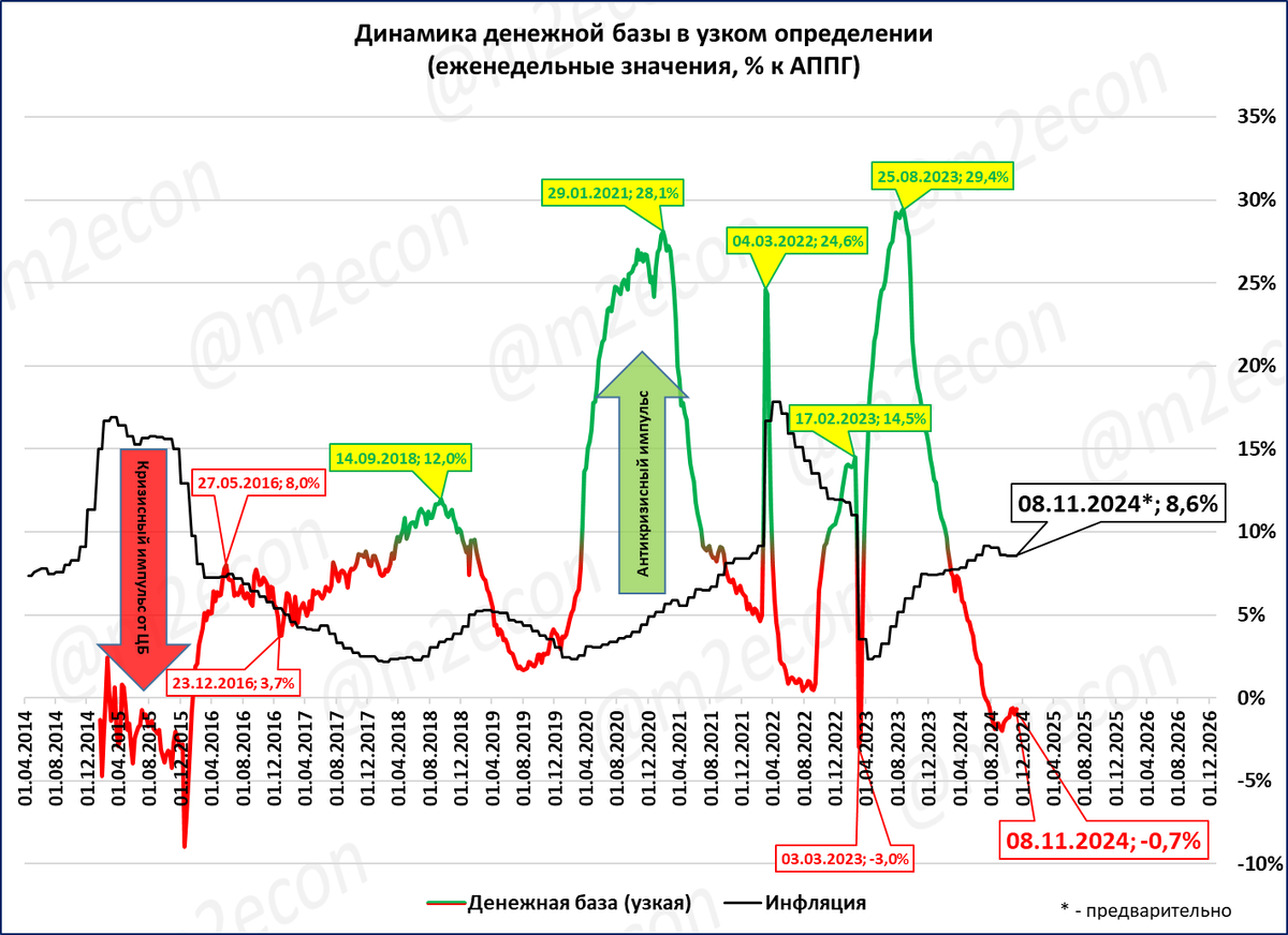 С учётом инфляции, которая превышает 8%, в реальном выражении узкая денежная база сжимается.