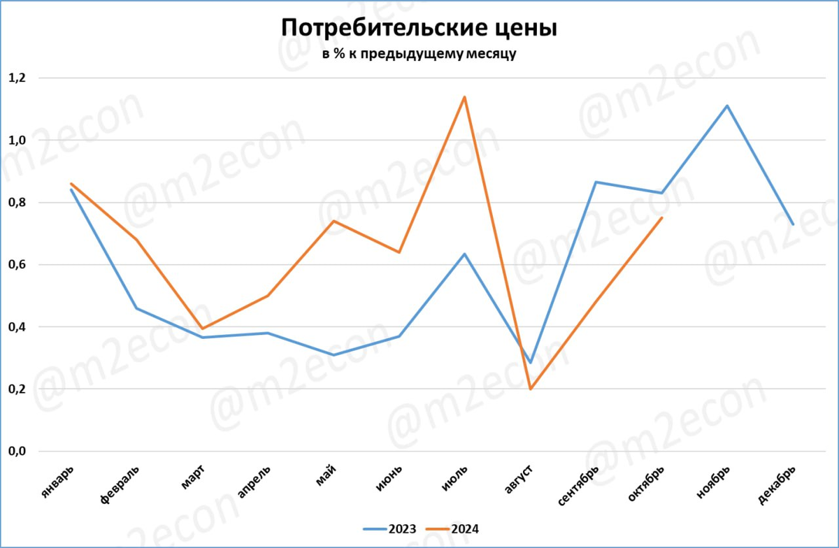 Месячный рост цен ниже прошлогоднего, начиная с августа. В октябре эта тенденция сохранилась.