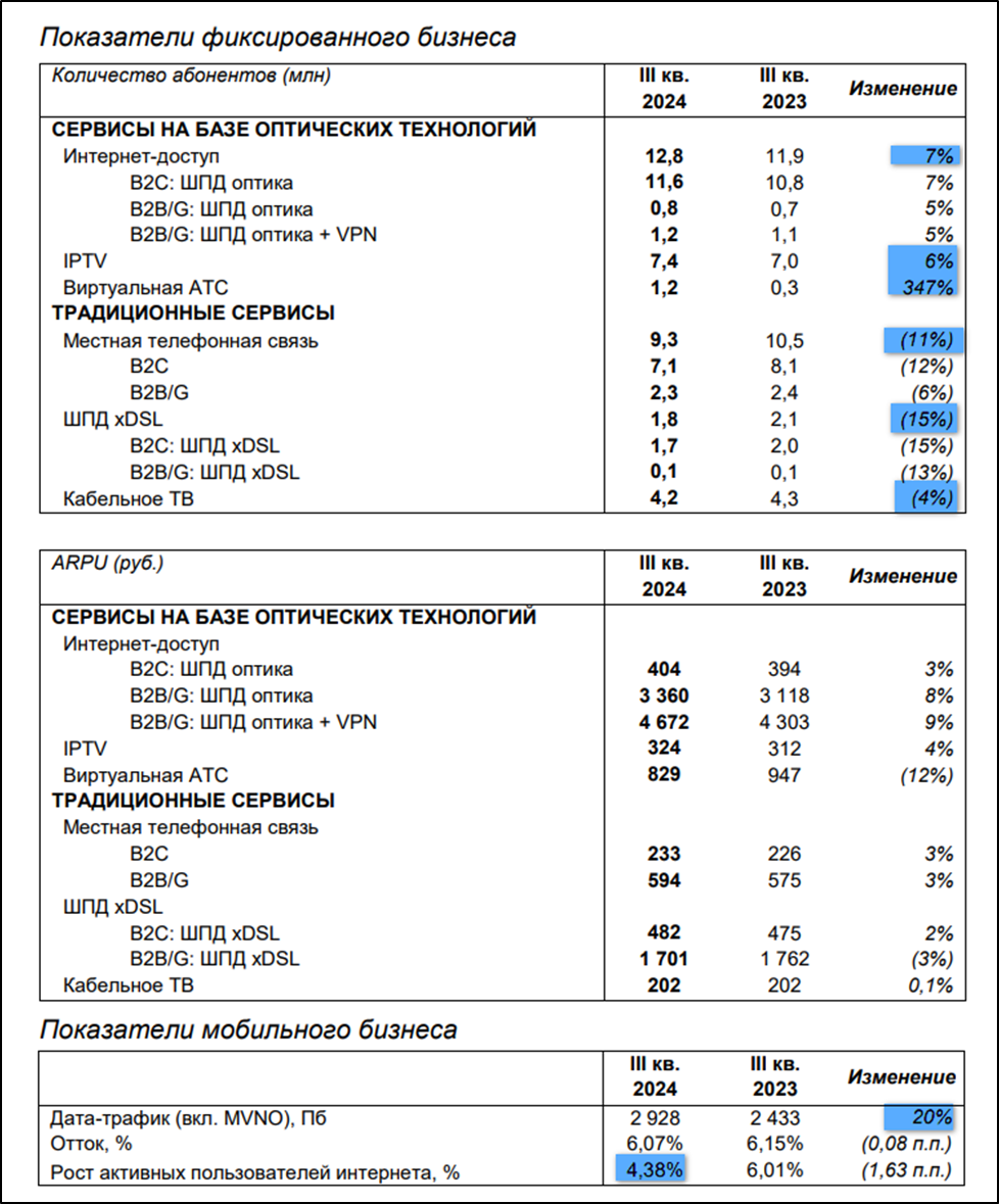 Интернет-абонентов 12,8 млн (+7% г/г). Из них 91% подключенные по волоконно-оптическим сетям. APRU (Average Revenue Per User, или средний доход на пользователя) таких абонентов 404₽ (+3% г/г).