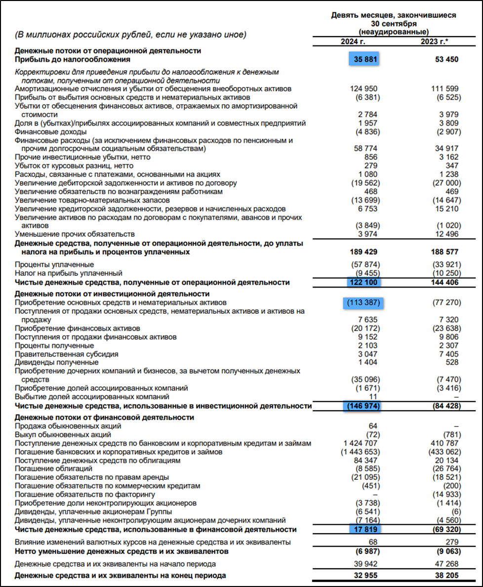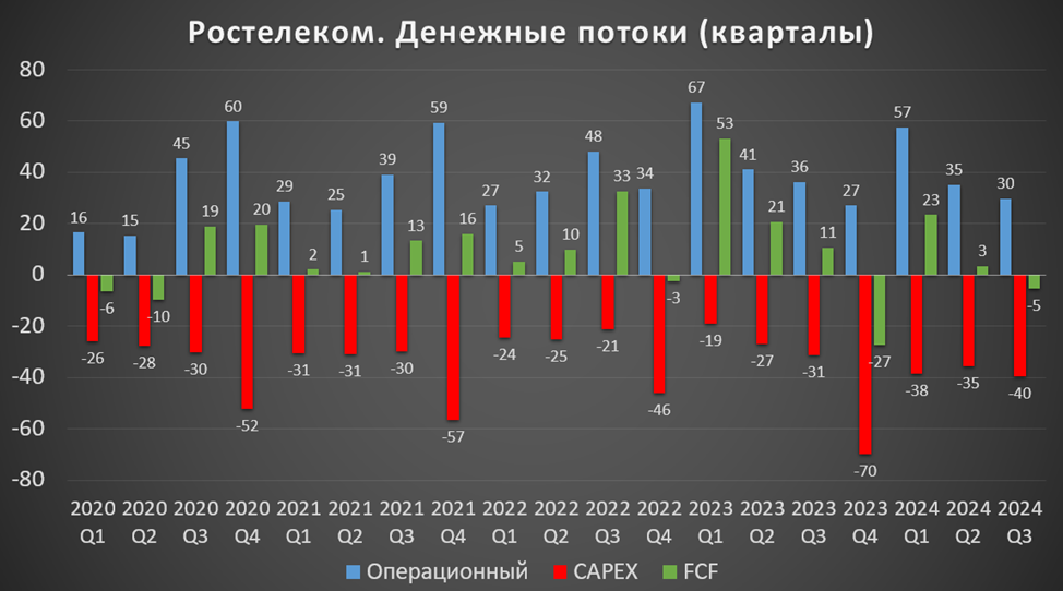 В 3Q24 операционный поток средний, кап затраты высокие, в итоге, FCF отрицательный.
