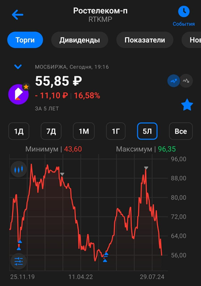 В конце мая я почти на максимумах продал привилегированные акции Ростелекома. Зафиксировал прибыль более 60%. На данный момент пока не планирую добавлять акции этой компании в портфель