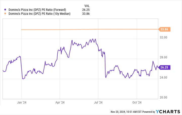 Сейчас бумаги эмитента торгуются по цене, в 26 раз превышающей консенсусную прибыль на акцию 2024 года в размере $16,71 как форвардное отношение цены к прибыли (P/E). Примечательно, что этот уровень значительно ниже 10-летнего среднего показателя компании по мультипликатору прибыли, который близок к 34. По мнению экспертов это говорит о том, что покупка акций Domino's Pizza является выгодной сделкой по текущей цене.