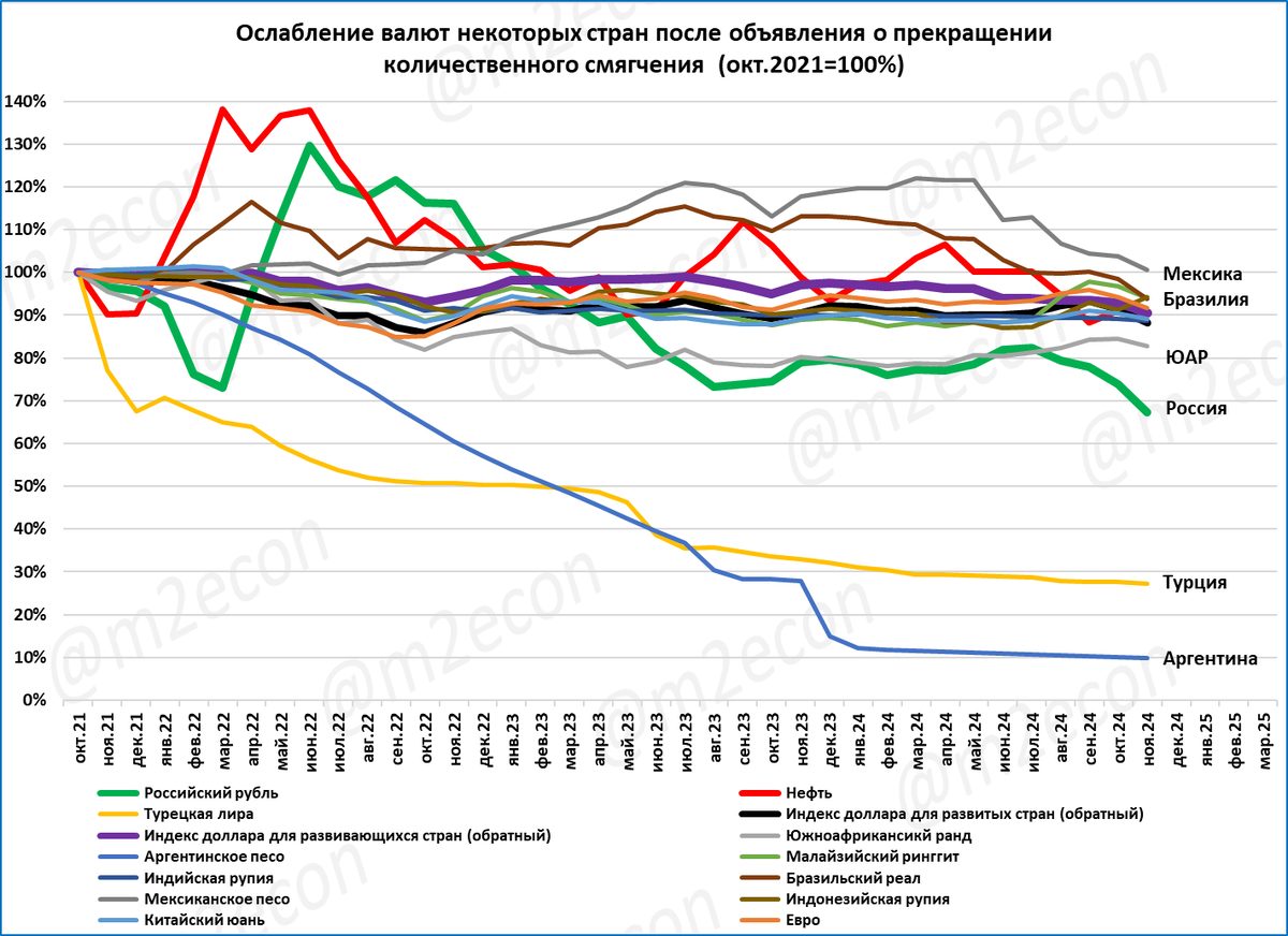 Российский рубль входит в тройку аутсайдеров наряду с аргентинским песо и турецкой лирой. Если до этого рубль держался поодаль от песо и лиры, то сейчас он стал приближаться к этой двойке наиболее обесценившихся валют.