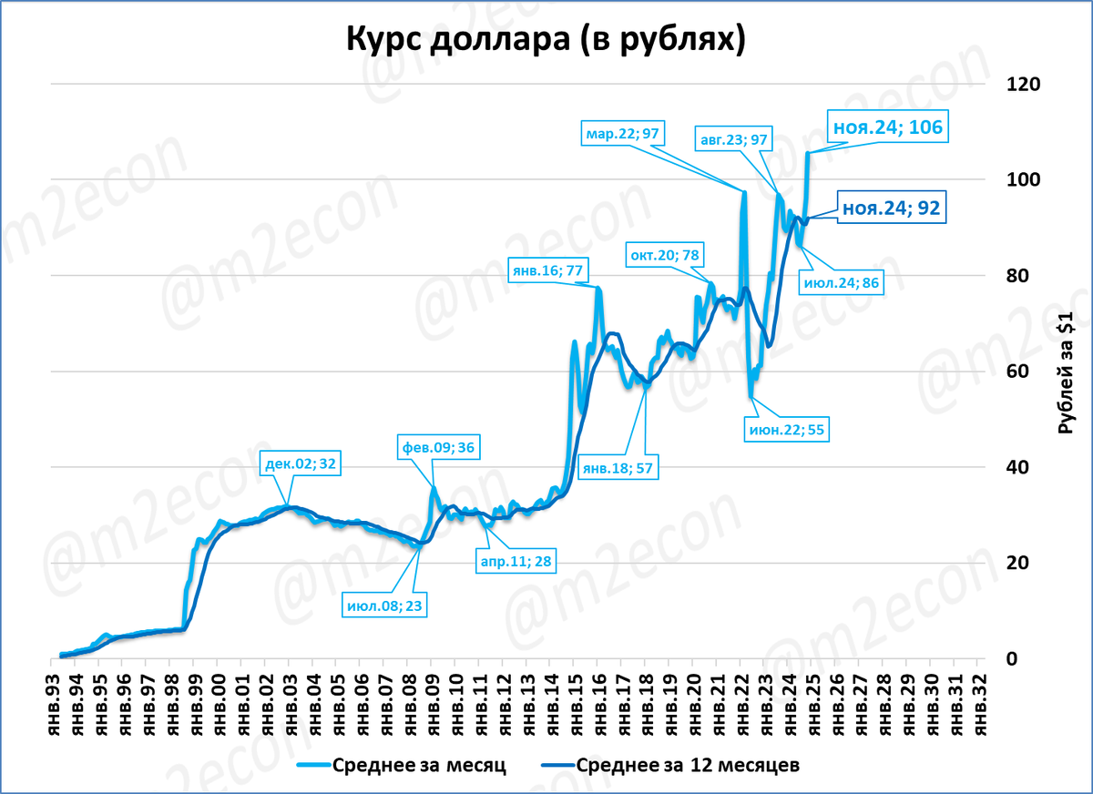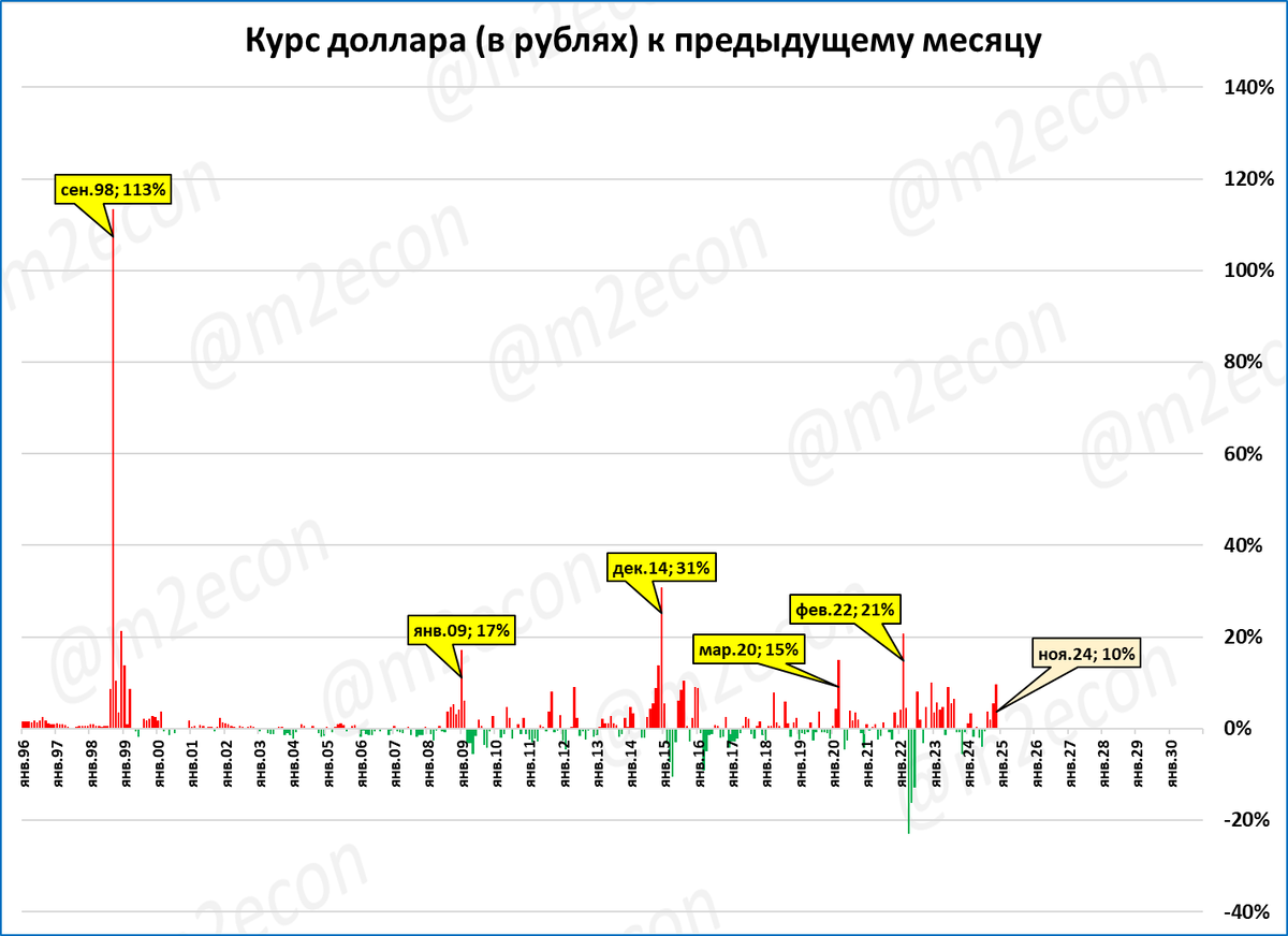 Резкие скачки курса (>15% к предыдущему месяцу) показаны жёлтыми выносками.