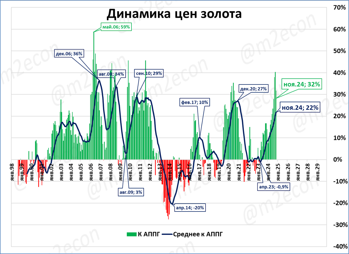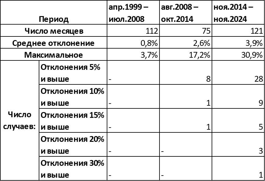 С ноября 2014 по ноябрь 2024 таких отклонений было уже 28. Причём величина этих отклонений тоже выросла (см. таблицу).