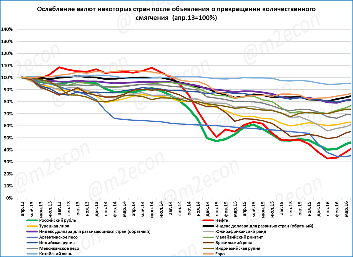 Когда ФРС весной 2013 года объявила о предстоящем в 2014 году сворачивании количественного смягчения, валюты развивающихся стран отреагировали на это снижением.