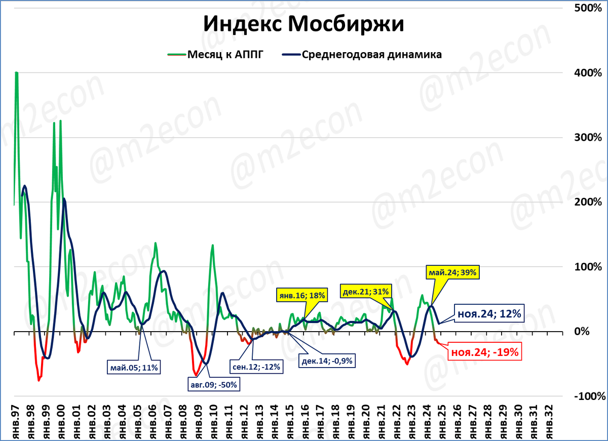 Индекс Мосбиржи падает в годовом выражении. Это четвёртый месяц падения после 16 месяцев роста подряд. Темпы падения ускоряются.