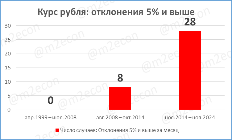 С августа 2008 по октябрь 2014 года таких отклонений было уже 8 (5 из них пришлись на 2008-2009 кризисные годы).