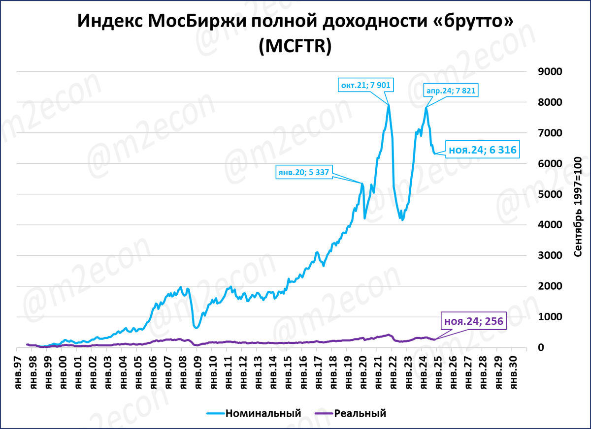 Индекс полной доходности учитывает выплаты дивидендов. По итогам октября 2024 года индекс полной доходности вырос в 63 раза с сентября 1997 года (со 100 до 6 316 пунктов; голубая линия на графике).