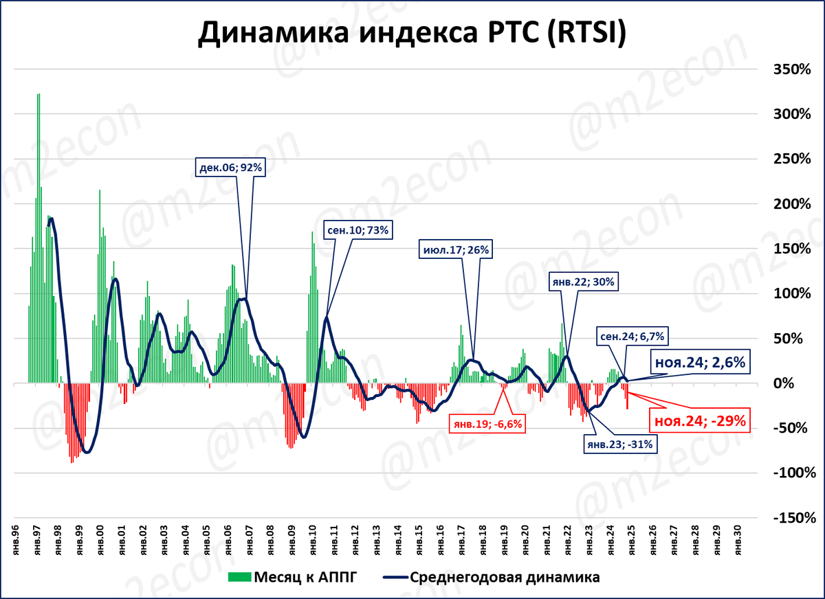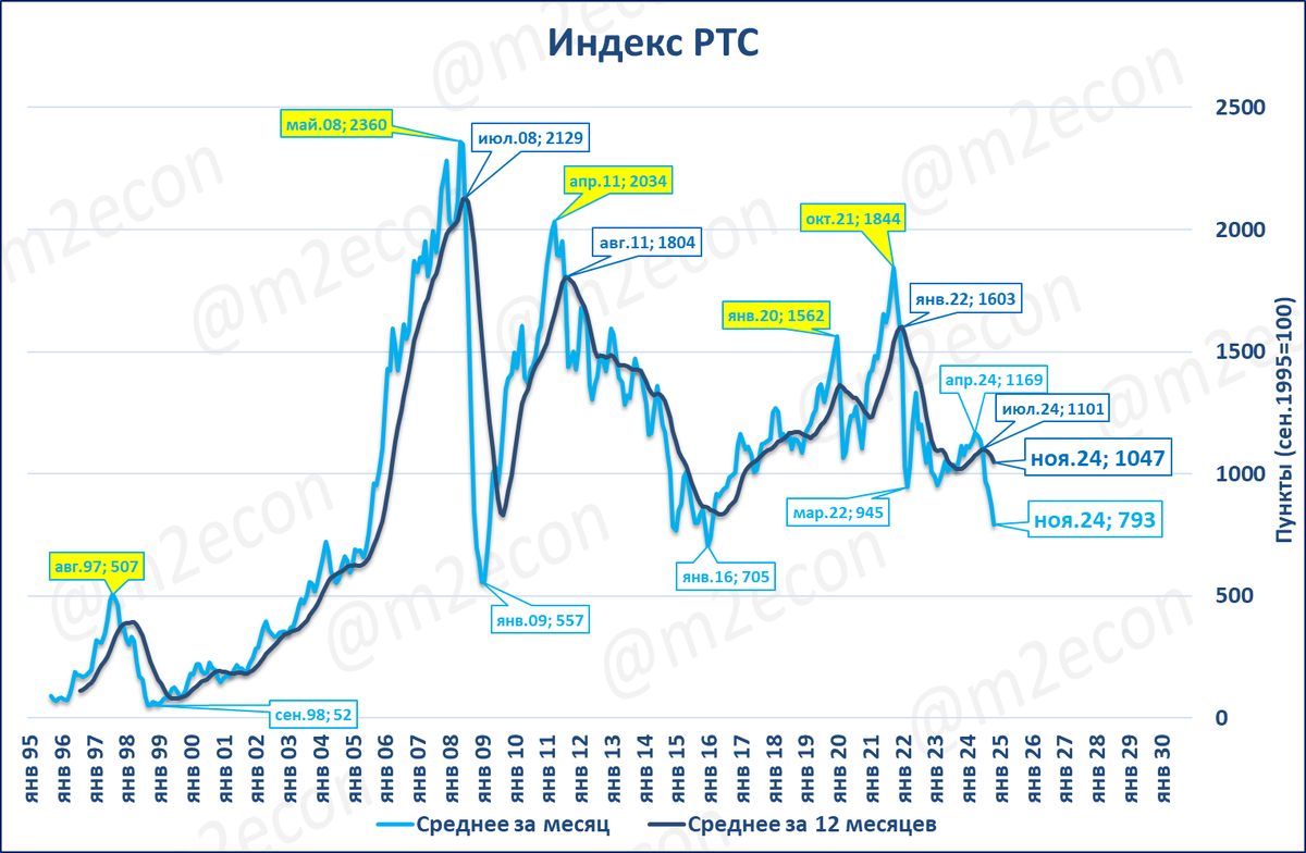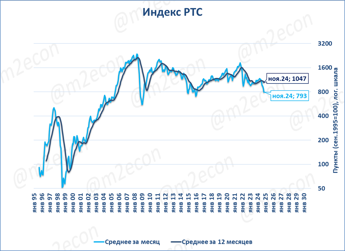 Индекс РТС в ноябре составил 793 пункта, (-29% годовых). Это четвёртый месяц падения после 8 месяцев роста подряд.