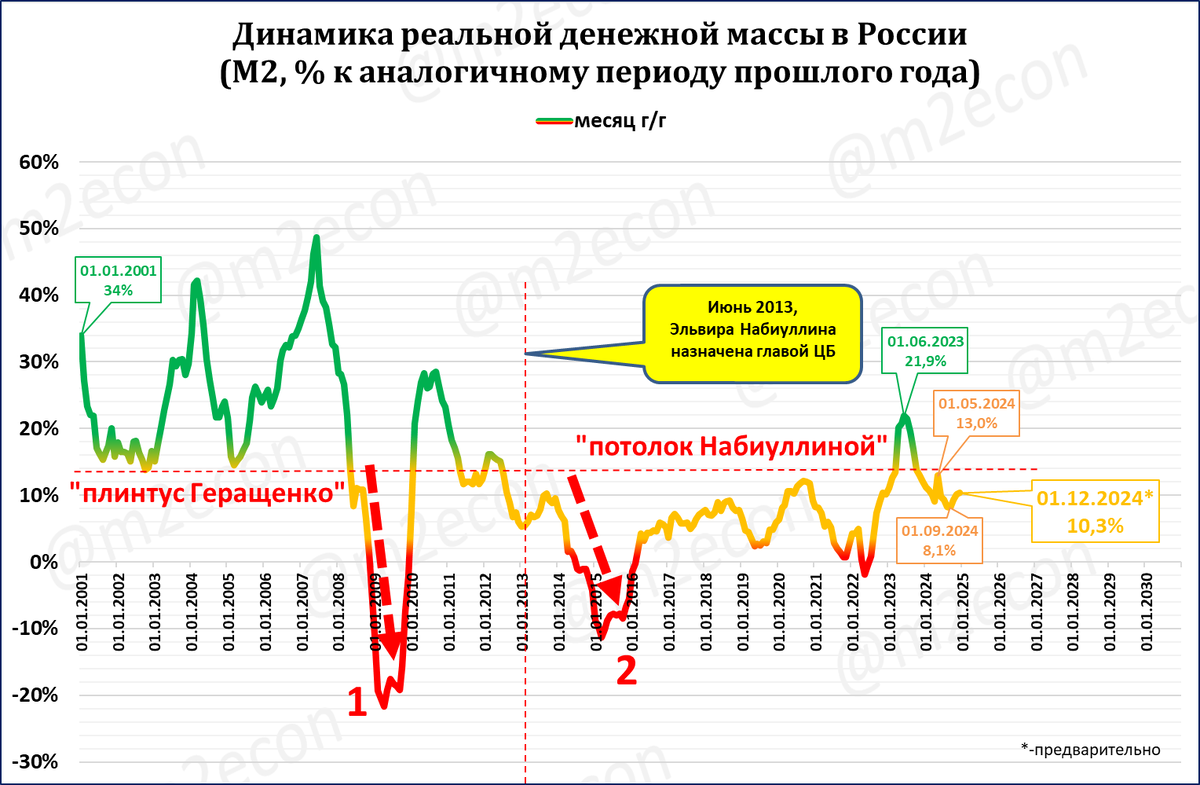 Для Набиуллиной такой рост РДМ — неплохой результат, почти её “потолок”. Но для времён 2000-2008 такой рост реальной денежной массы (РДМ) — ниже плинтуса.
