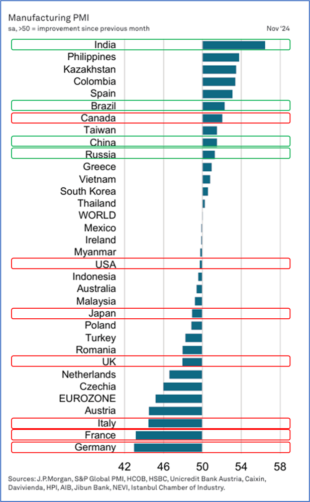 Сравним индекса PMI в производственном секторе между странами БРИК (Бразилия, Россия, Индия, Китай) и странами "Большой семерки" (G7, представляющими коллективный Запад).