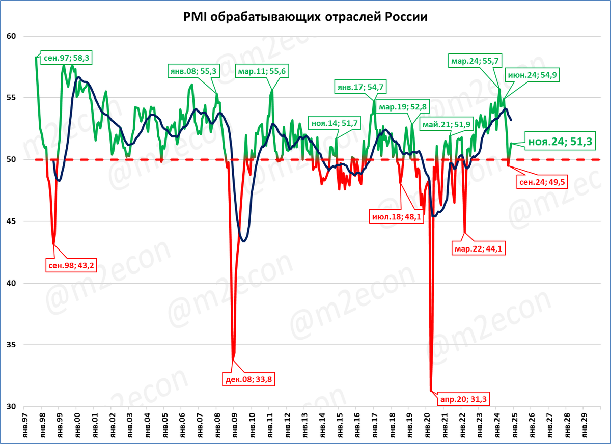 PMI в обрабатывающей промышленности в ноябре вырос до 51,3 пункта. Значение индекса выше 50 пунктов говорит о росте, ниже 50 пунктов — о снижении деловой активности.
