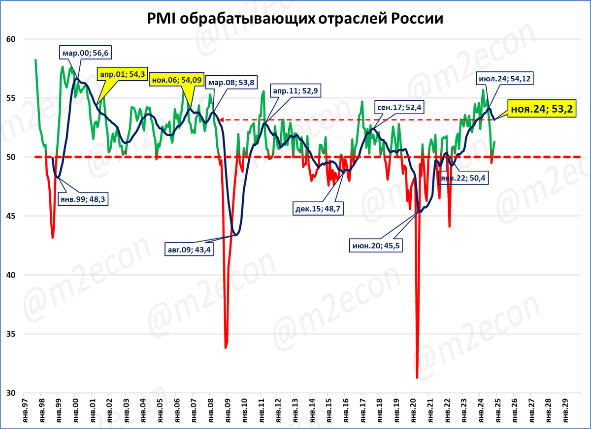 В ноябре падение деловой активность в промышленности закончилось, но рост не начался. Индекс на границе, 50 пунктов.