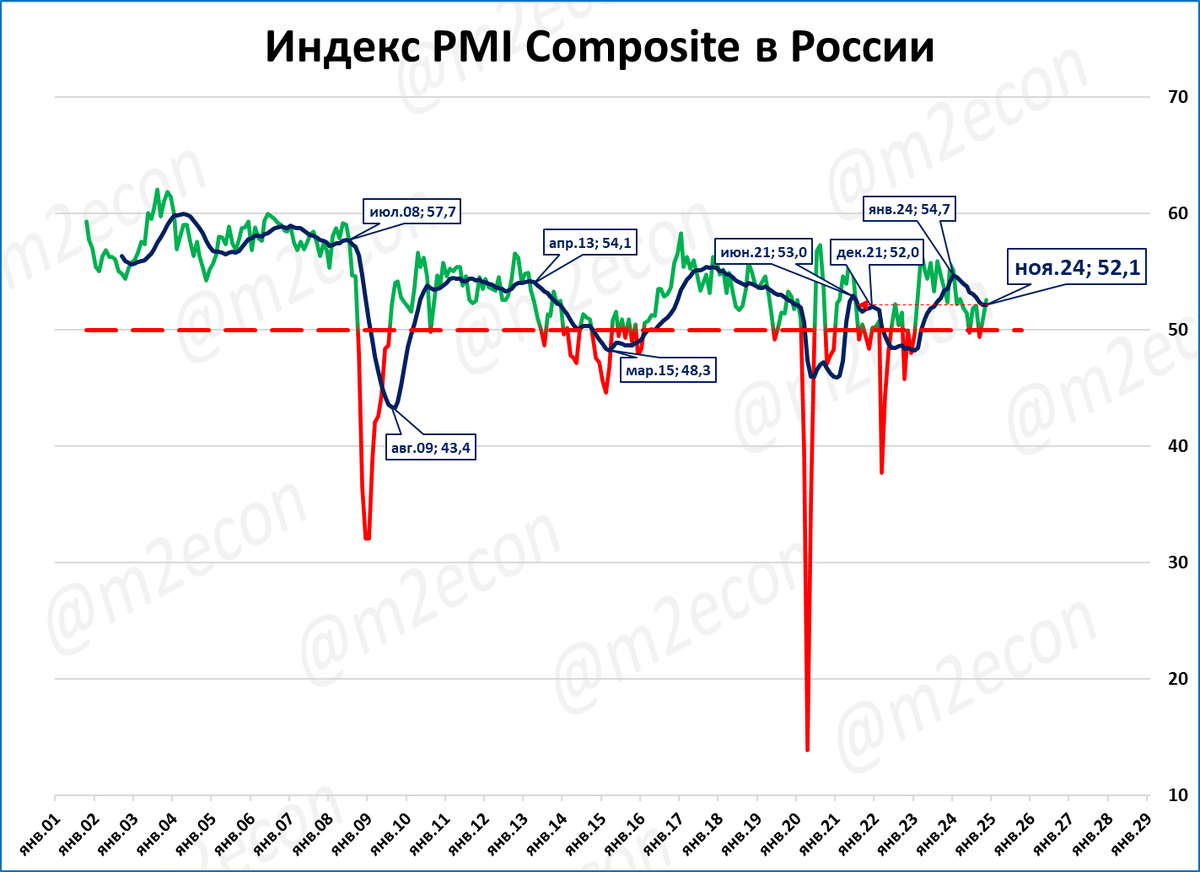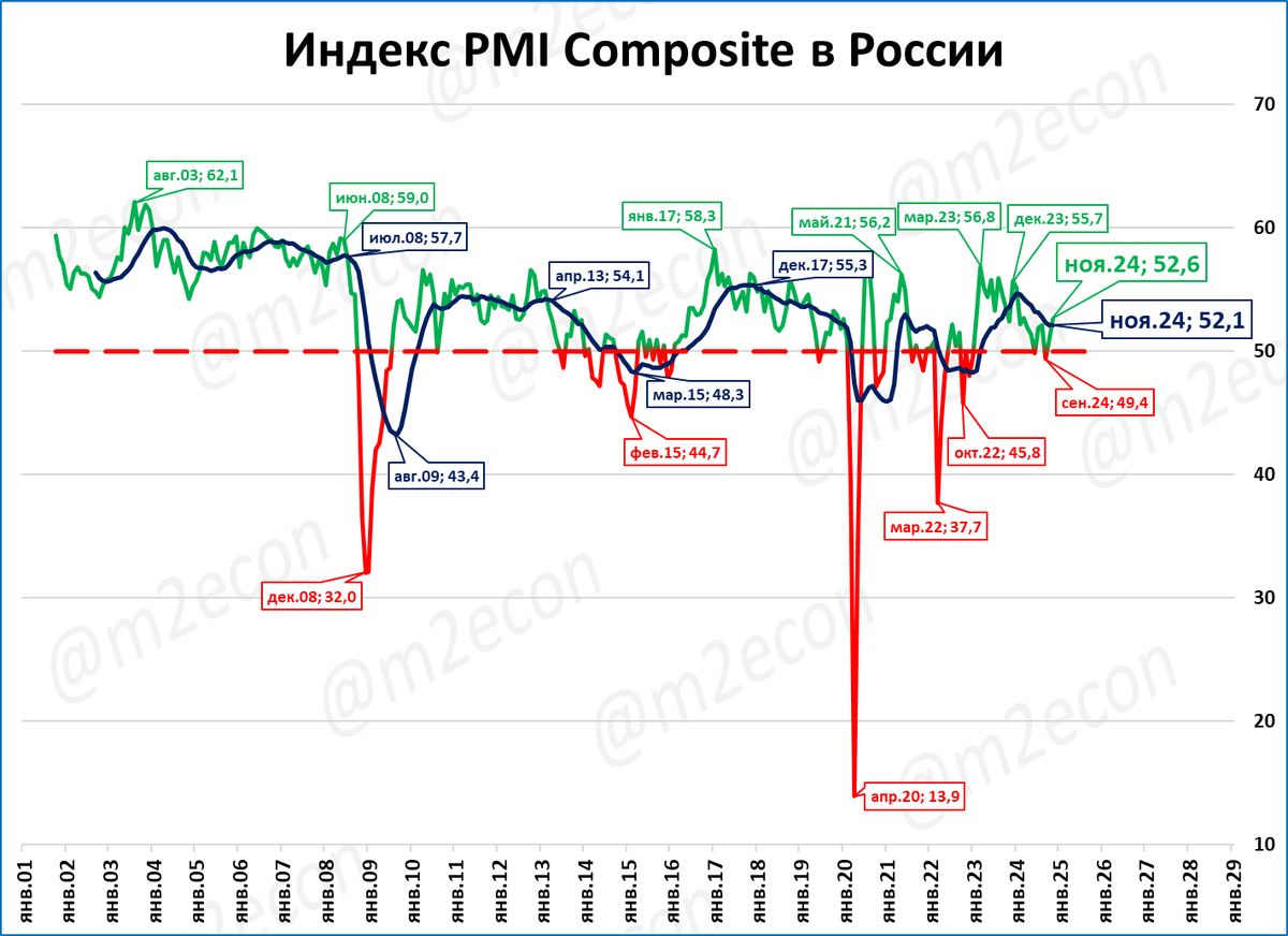 Композитный индекс (промышленность + услуги) тоже находится выше 50 пунктов (= растёт деловая активность в экономике в целом).