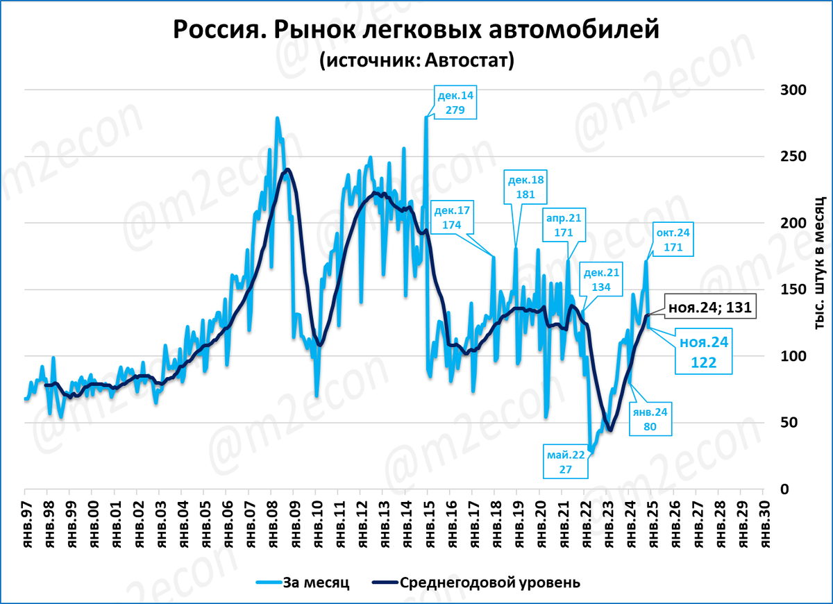 Рынок легковых автомобилей вырос на 11% к ноябрю прошлого года до 122 тыс. штук. Текущий тренд ведёт к 1,58 млн. по итогам года.