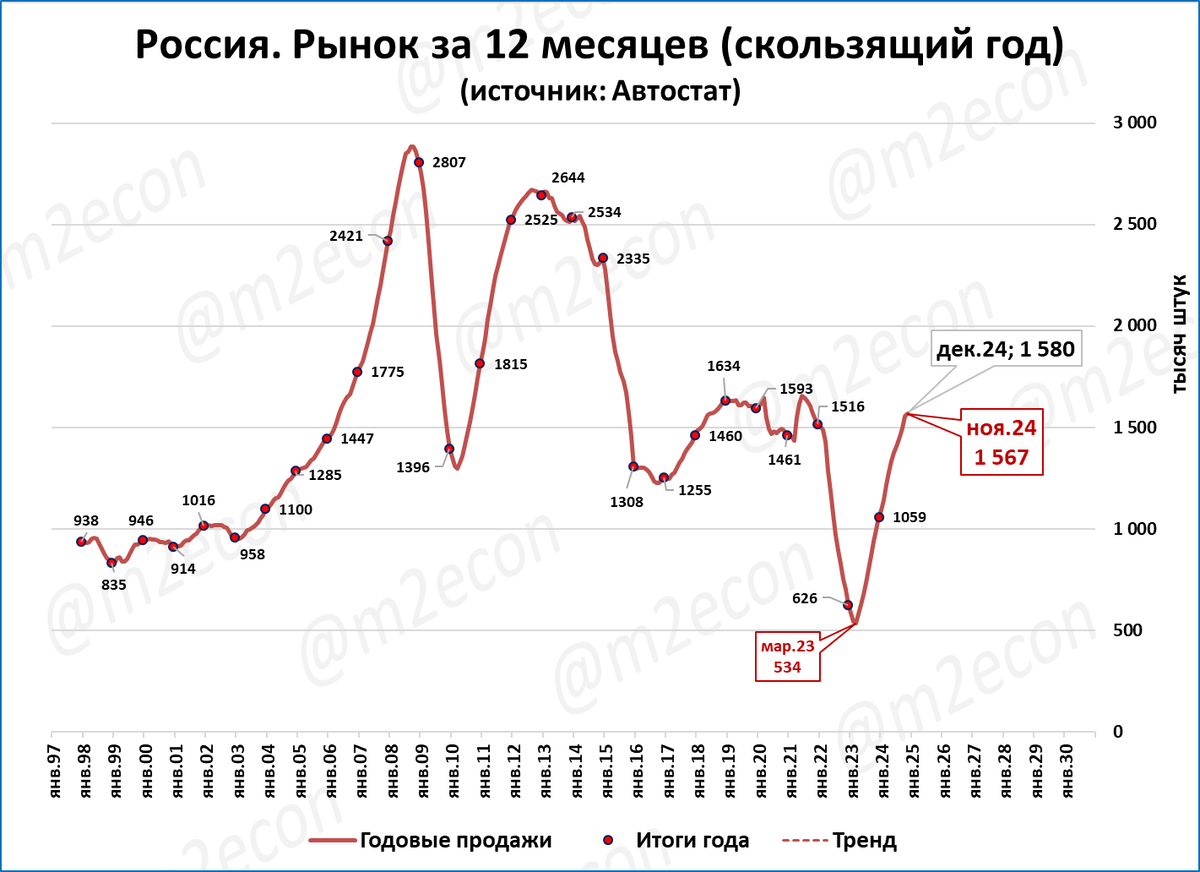 Продажи за последние 12 месяцев (скользящий год) уверенно превысили отметку в 1,5 млн и составили по итогам ноября 1,567 млн. штук.