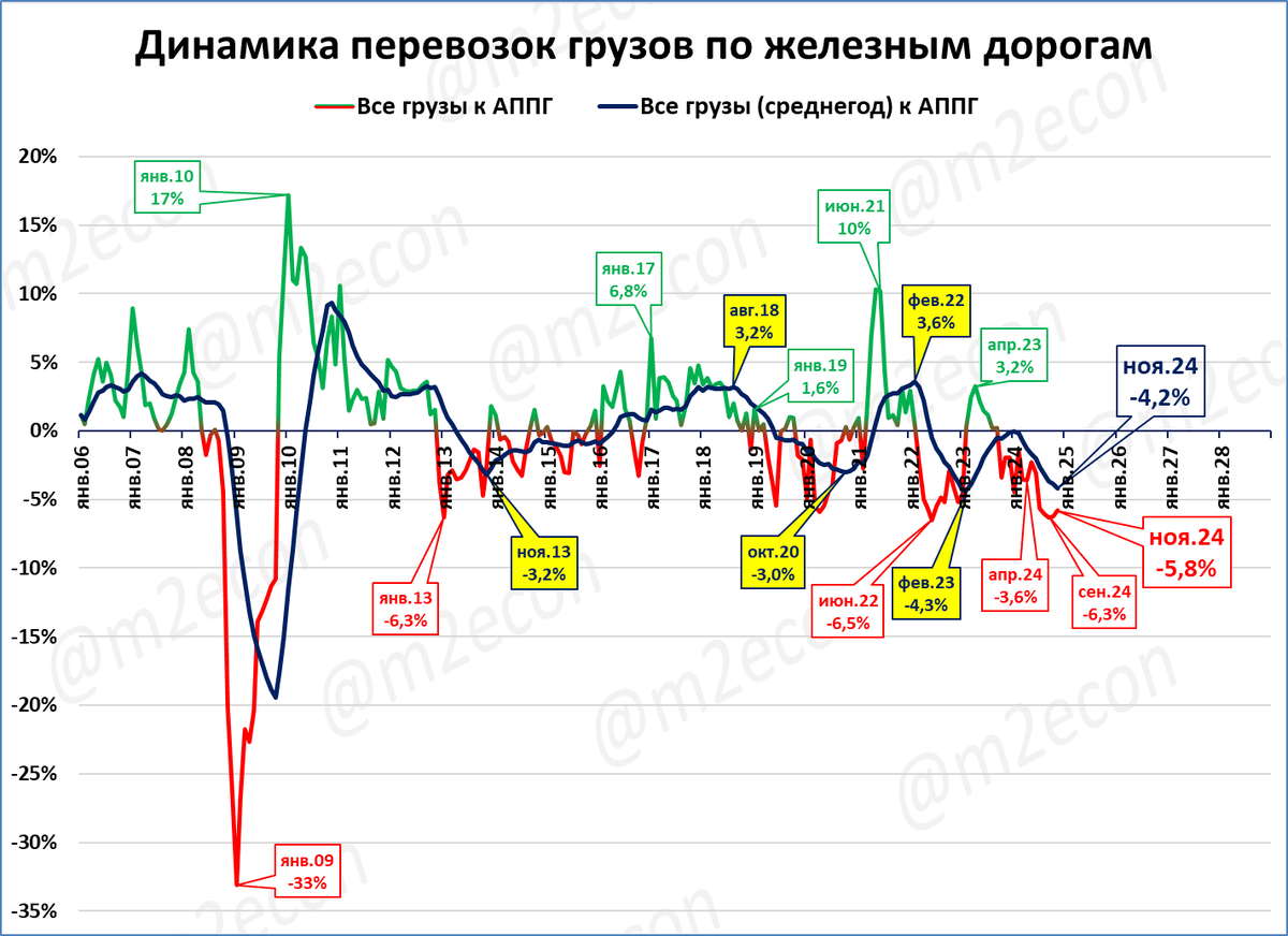 О возможных причинах снижения перевозок по железным дорогам см. также "Экспресс-обзор за май 2024".