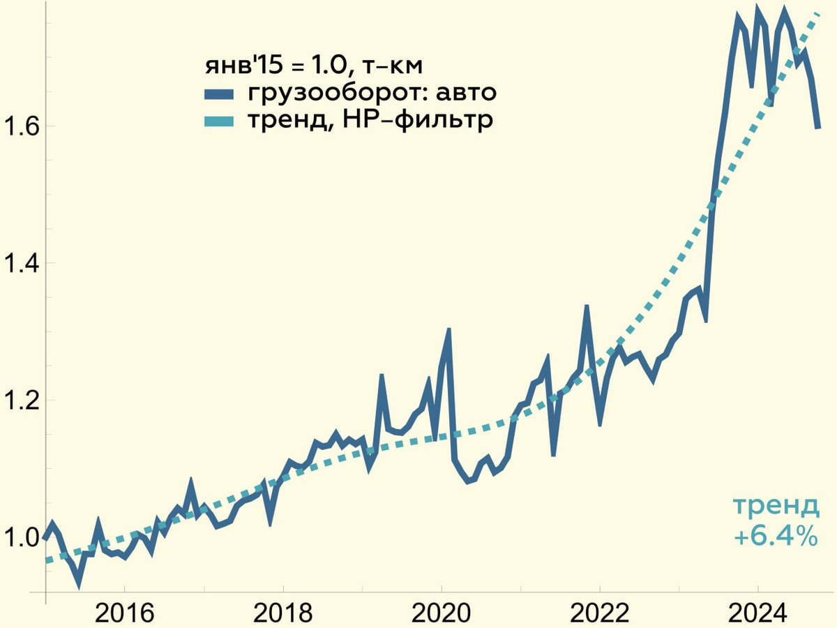 Как минимум, частично падение перевозок по железным дорогам (с 1,3 до 1,2 млрд. тонн в 2019 и 2024 годах, соответственно) компенсируется ростом автомобильных грузоперевозок.