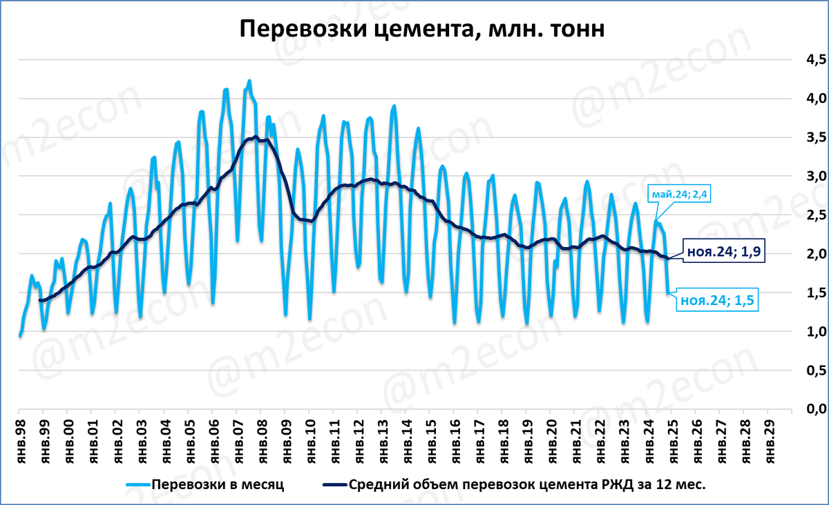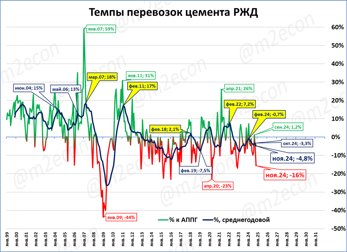 Перевозки цемента по железным дорогам в ноябре на 16% ниже, чем в ноябре прошлого года. Падение продолжается.
