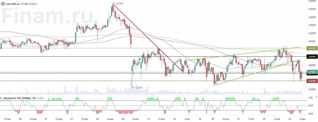 В начале декабря котировки «Интер РАО» пробили нижнюю границу восходящего клина, в рамках которого двигались с сентября 2024 г. Акции совершили отскок от уровня поддержки в районе 3,60 руб. и в настоящее время вернулись в пределы широкого многомесячного бокового коридора с границами 3,70–3,90 руб.