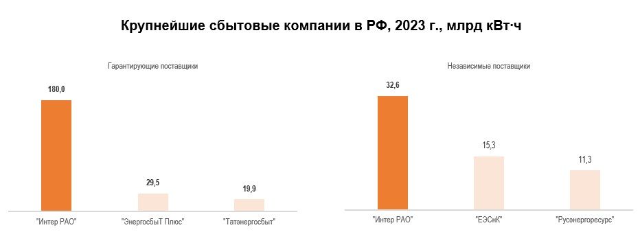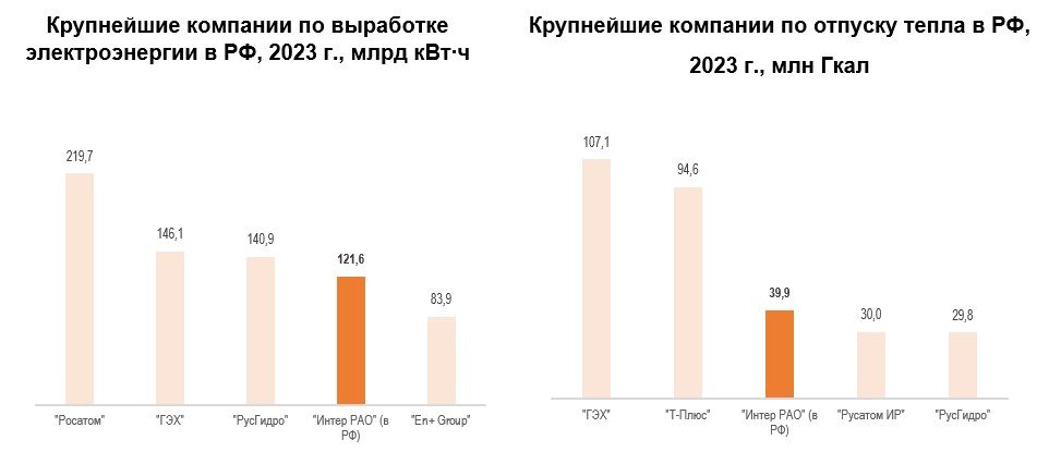 По состоянию на конец 2023 г. установленная мощность объектов под управлением «Интер РАО» составляла 30,8 ГВт. Компания лидирует по объему сбыта электроэнергии, занимая первое место в России как среди гарантирующих, так и среди независимых поставщиков. В 2023 г. «Интер РАО» находился на четвертом месте среди российских генерирующих компаний по объему выработки электроэнергии, уступив «Росатому», «Газпром энергохолдингу» и «РусГидро». По объемам отпуска тепловой энергии холдинг занимал третье место, уступив «Газпром энергохолдингу» и «Т-Плюс». Доля «Интер РАО» на российском рынке электроэнергии составляла 18,5%, при этом на долю холдинга приходилось 10,3% генерации в России.