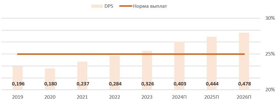 Устойчивое финансовое положение «Интер РАО» делает энергохолдинг одним из наиболее стабильных плательщиков дивидендов среди электроэнергетического сектора России. Рост чистой прибыли под влиянием увеличения процентных доходов по итогам 2024 г. позволит энергохолдингу увеличить объем выплат акционерам. Тем не менее «Интер РАО» сохраняет низкую для сектора норму выплат в 25% от чистой прибыли по МСФО, что заметно снижает дивидендную привлекательность акций. На данный момент увеличение нормы выплат не стоит на повестке дня компании.