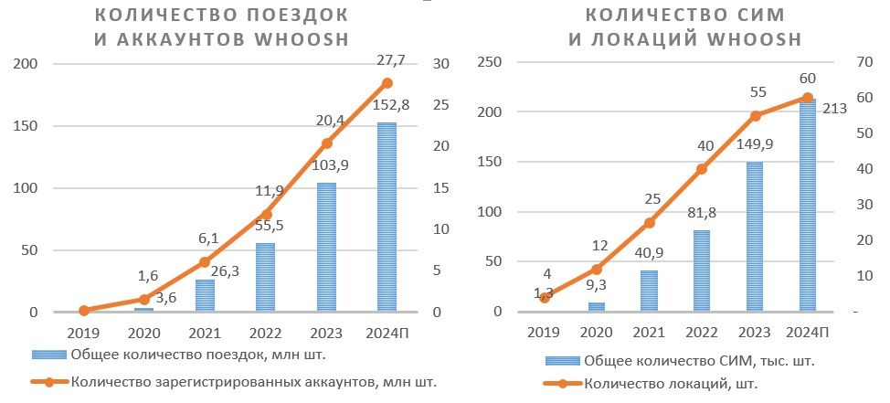 Whoosh — лидер быстрорастущего рынка. В денежном выражении Whoosh в 2023 г. занимала 48% рынка, доля флота компании в общем объеме парка — 45%, а доля в общем объеме поездок — 49%. Активный рост рынка в ближайшие годы будет способствовать сопоставимому росту выручки, а лидерство на рынке позволит компании управлять маркетингом эффективнее конкурентов.