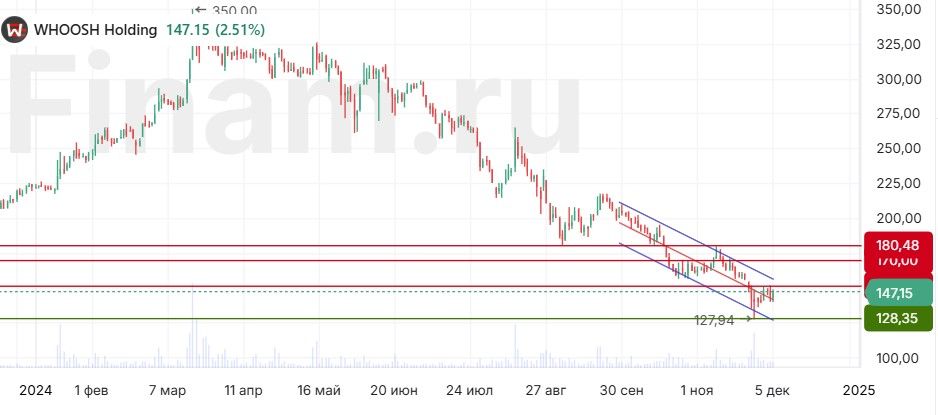 Акции Whoosh на дневном графике недавно установили новый исторический минимум — 128 руб., после чего отскочили. Ближайшей целью для роста выступает отметка 150 руб., далее уровнями сопротивления выступают отметки 170 и 180 руб. В случае снижения поддержку окажет уровень 128 руб. Отметим, что котировки от абсолютного минимума отскочили уже на 18%. Ранее акции Whoosh уже отскакивали примерно на 20% от локальных минимумов и снова переходили к снижению. Поэтому не исключаем, что ситуация повторится возле отметки 150 руб.