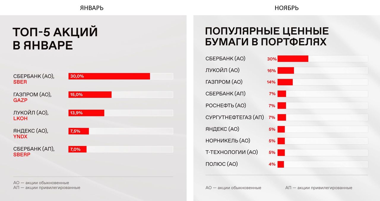 В ноябре частные инвесторы вложили в ценные бумаги 97,5 млрд рублей, следует из данных Московской биржи. В числе самых популярных остались давние фавориты - акции «Сбербанка» (на долю обычек пришлось 30%, а на префы - 7%), «Газпрома» (14%), «Яндекса» (5%), а также появившиеся с октября в «народном портфеле» на фоне золотой лихорадки бумаги «Полюса» (4%). Выбор розничного инвестора в целом можно назвать консервативным, причем с начала года долевое распределение топ-5 бумаг практически не изменялось. Столь же стабильной оставалась и доля физлиц в объеме торгов акциями: в январе биржа сообщала о 76%, а в ноябре - о 75,8%. В целом выбор частных инвесторов говорит об их интересе к долгосрочным инвестициям. Этот вывод подтверждает и недавнее исследование аналитической компании Frank RG и «ВТБ Мои Инвестиции».