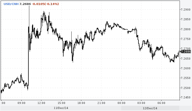 Накануне в среду, агентство Reuters со ссылкой на конфиденциальные источники сообщило, что высшее руководство Китая рассматривает возможность ослабления юаня в 2025 году, как отчетная мера на повышение пошлин со стороны США после возвращения Дональда Трампа в Белый дом. Вступающий 20 января в свою должность новый-старый республиканский президент заявил, что планирует ввести 10%-ную всеобщую импортную пошлину и 60%-ную пошлину на китайский импорт в США. Девальвация юаня может привести к удешевлению китайского экспорта, смягчив воздействие пошлин и создав более свободную денежно-кредитную политику в Китае.