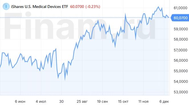 Доходность iShares U.S. Medical Devices ETF за последние 12 месяцев — порядка 16%. Ранее мы оценили потенциал роста бумаги на основе средневзвешенных консенсусных целевых цен бумаг, входящих в состав фонда. Остаток годового апсайда фонда, согласно такой методике оценки, составляет 7,2%.