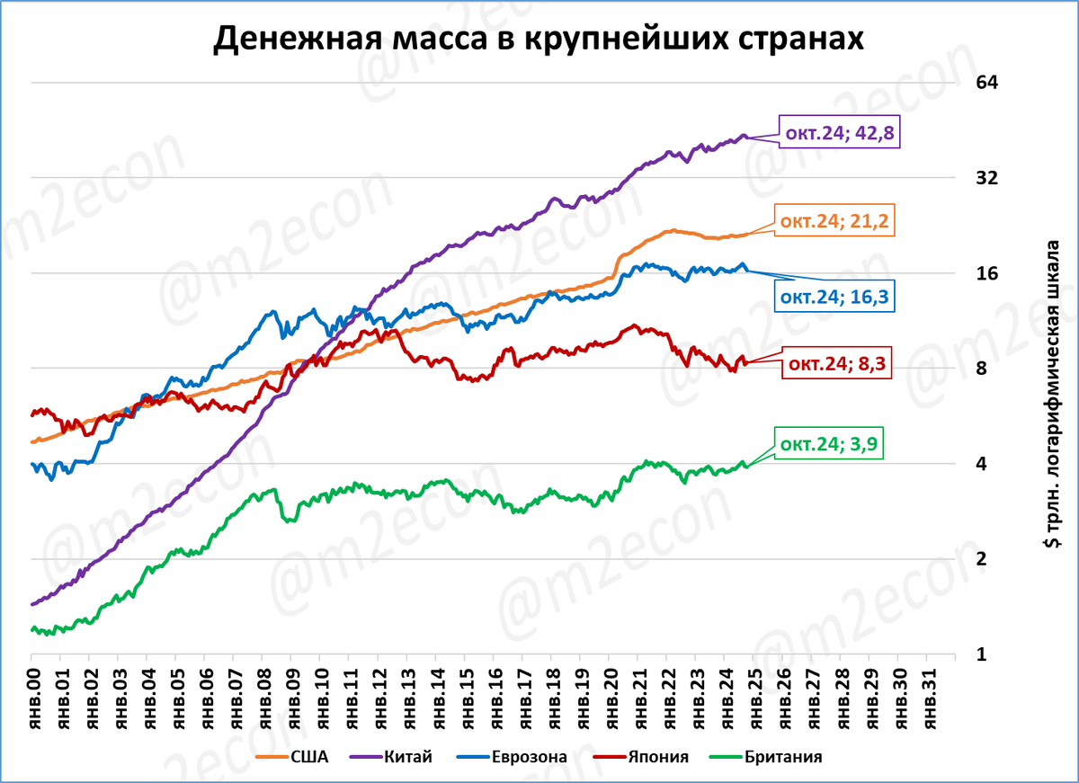 Денежная масса крупнейших стран: Китай лидирует с 2011 года.