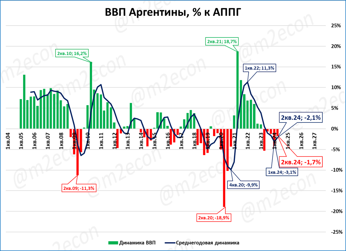 Падение ВВП в Аргентине во 2 квартале 2024 года составило -1,7%.