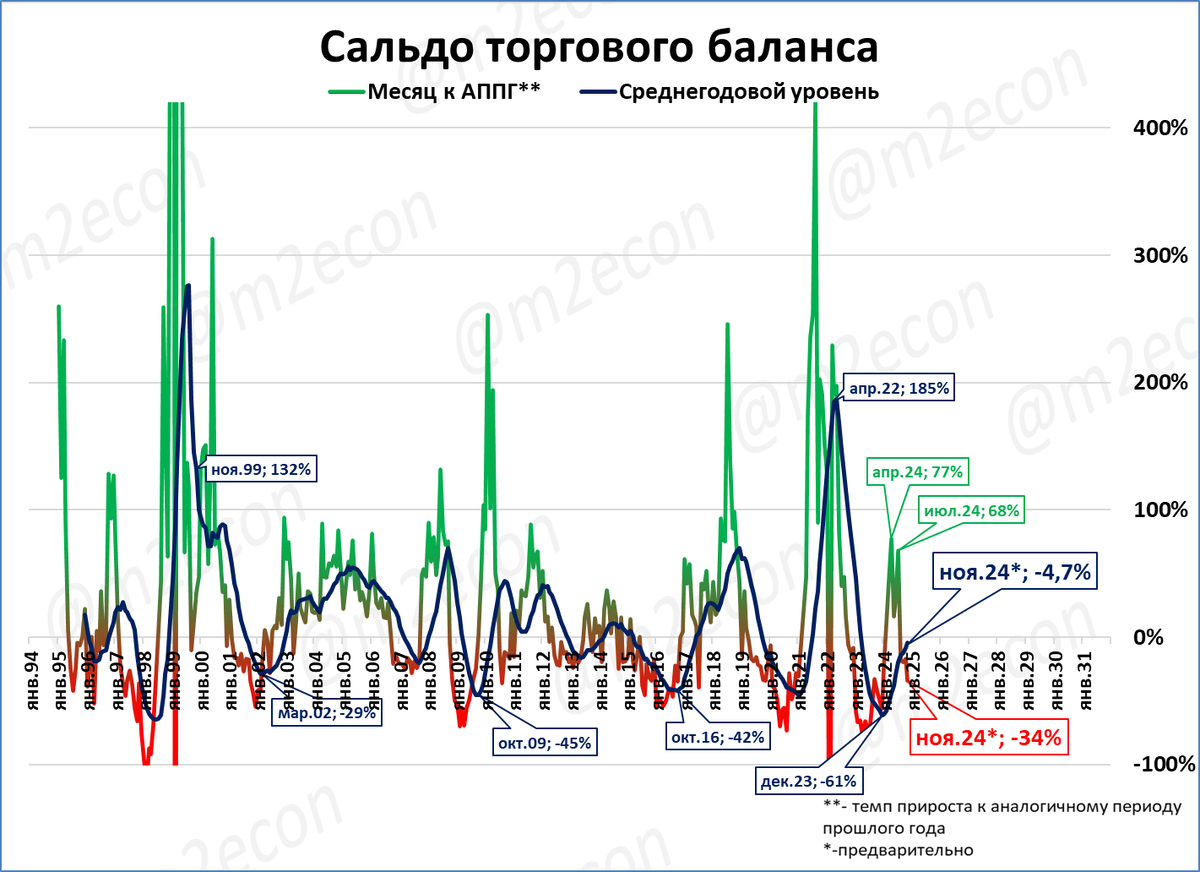 Сальдо торгового баланса России в ноябре составило 6,3 млрд. долларов. Падение к ноябрю прошлого года составило 34%. 12-месячное сальдо стабилизируется на уровне 120-140 млрд.