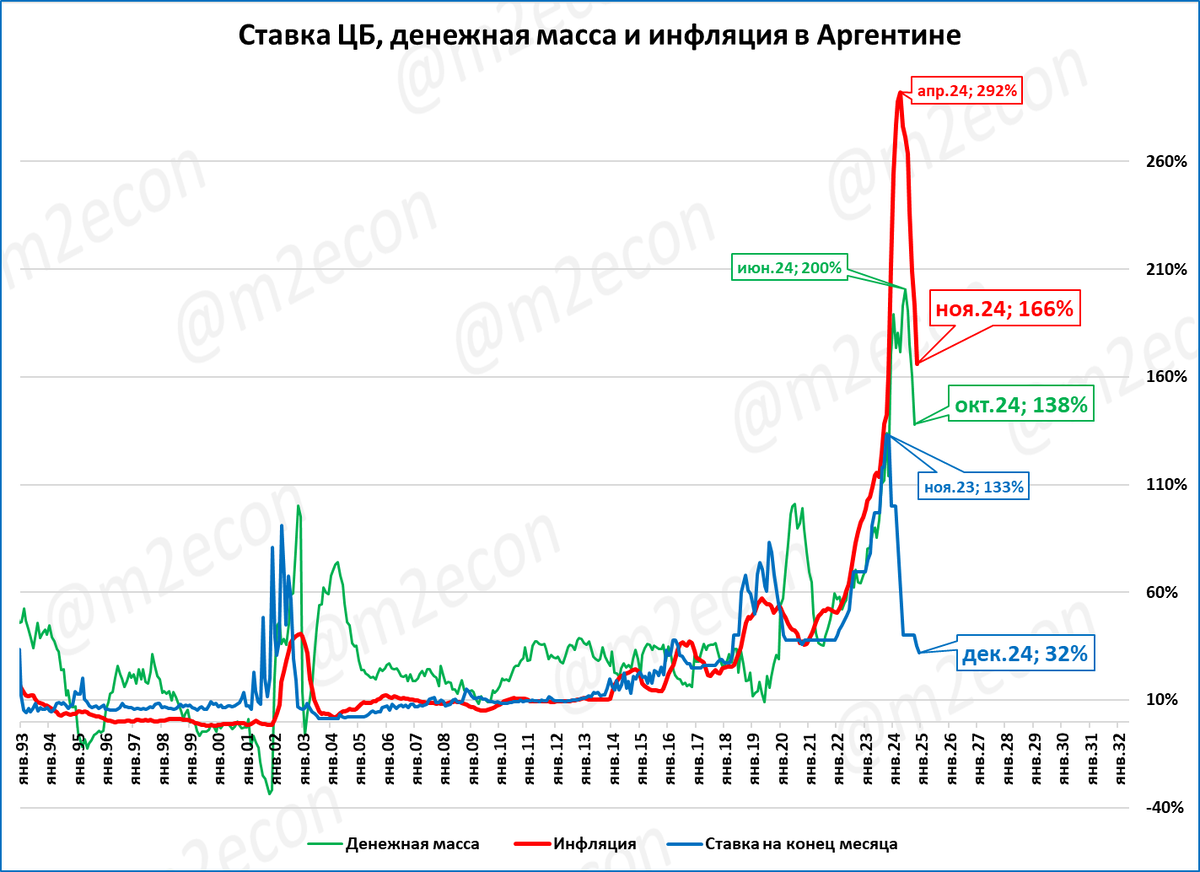 В Аргентине инфляция по итогам ноября составила 166%. Одна из причин высокой инфляции – низкая (32%) ставка ЦБ Аргентины. Реальная денежная масса сжимается. ВВП Аргентины во 2 квартале 2024 года упал на 1,7%.