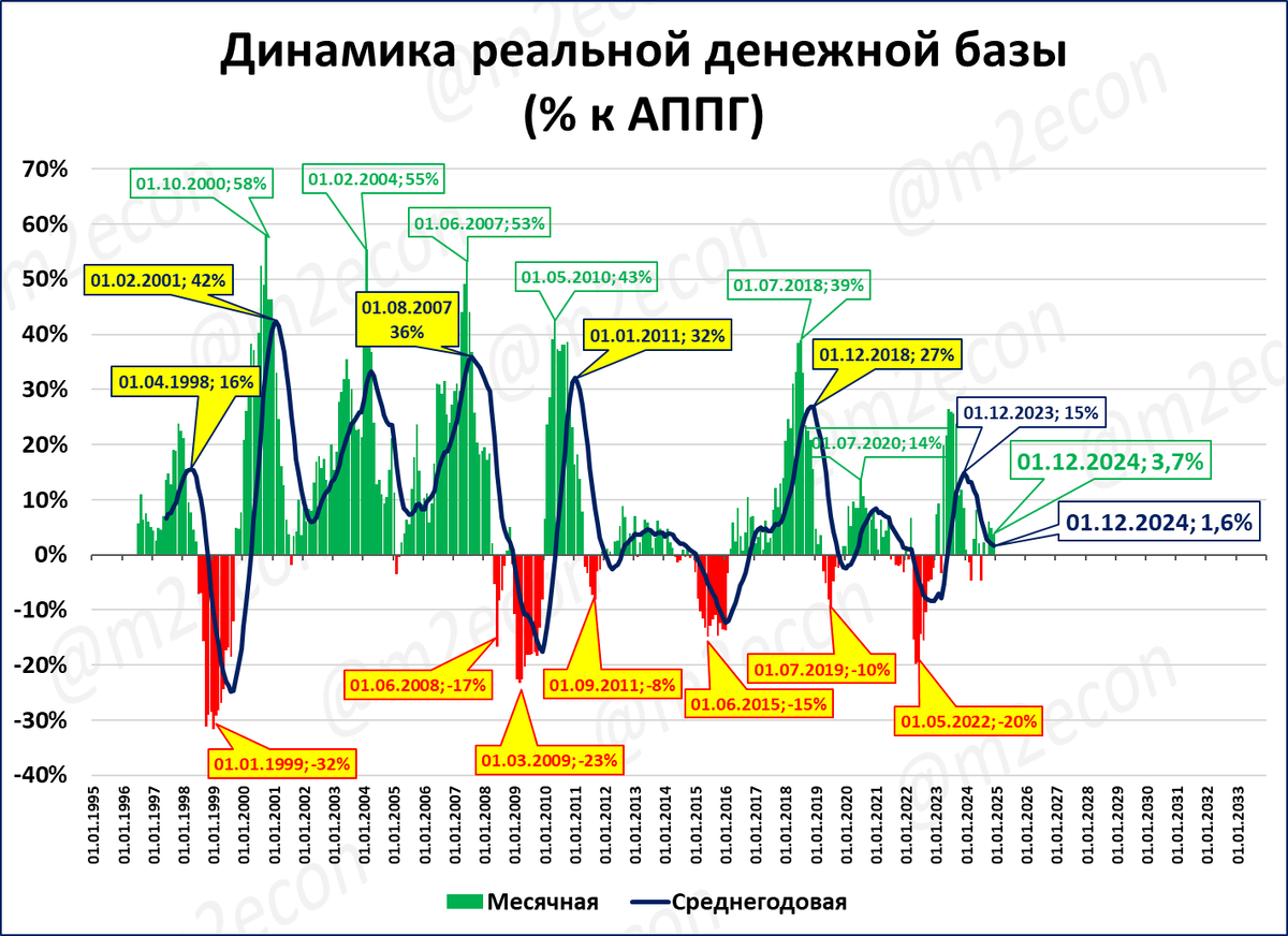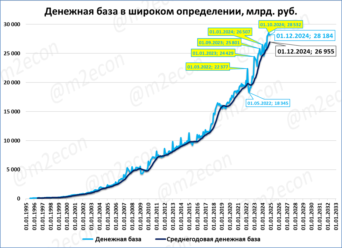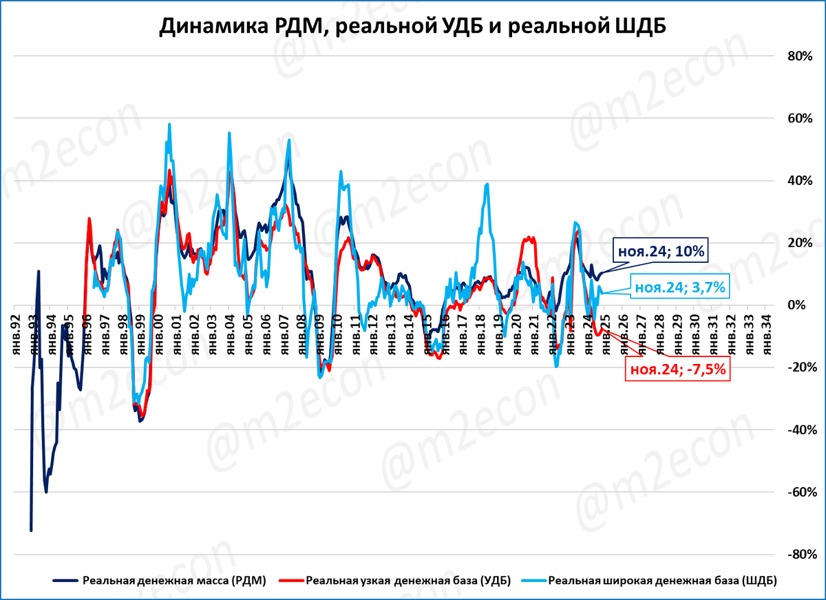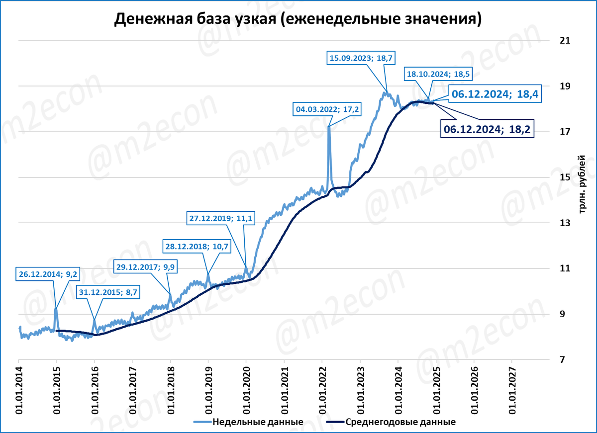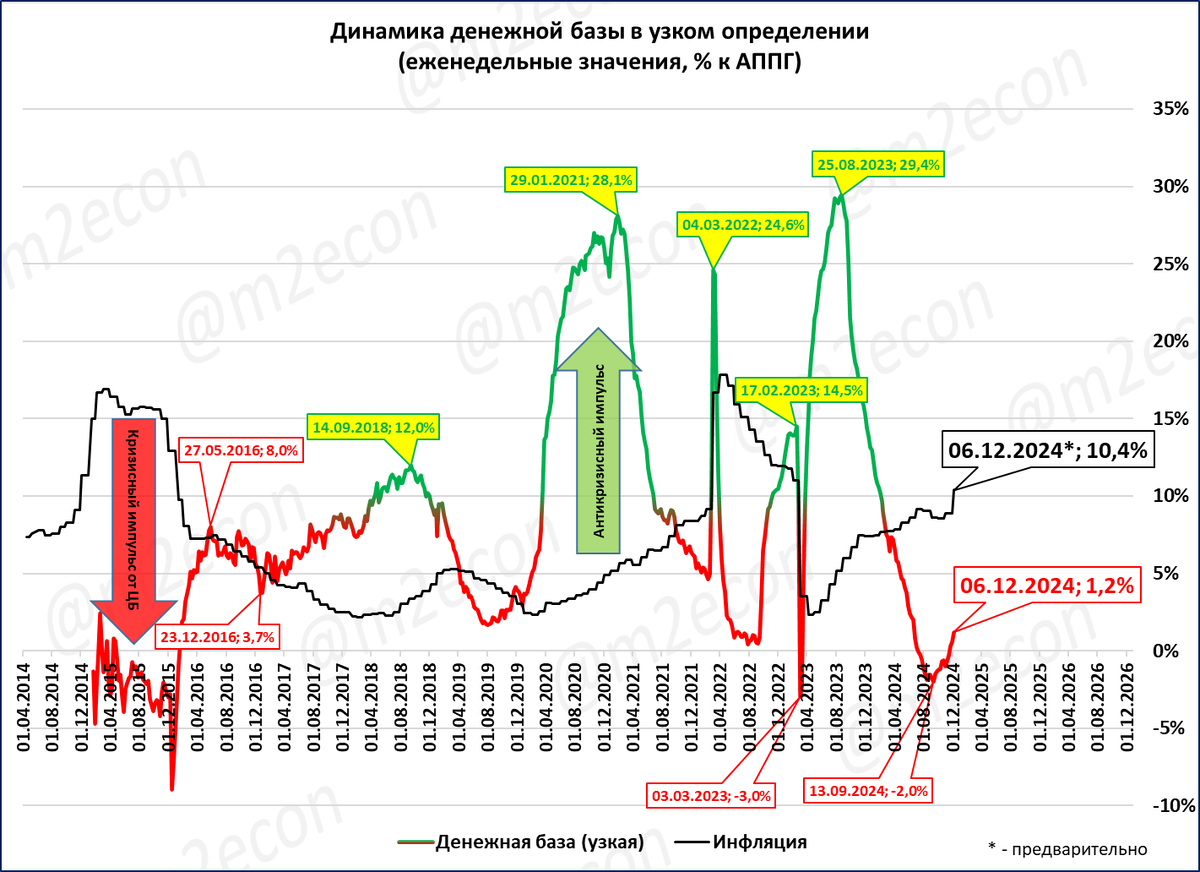 С учётом инфляции, которая, как ожидается, превысит 10% в декабре, в реальном выражении узкая денежная база сжимается.