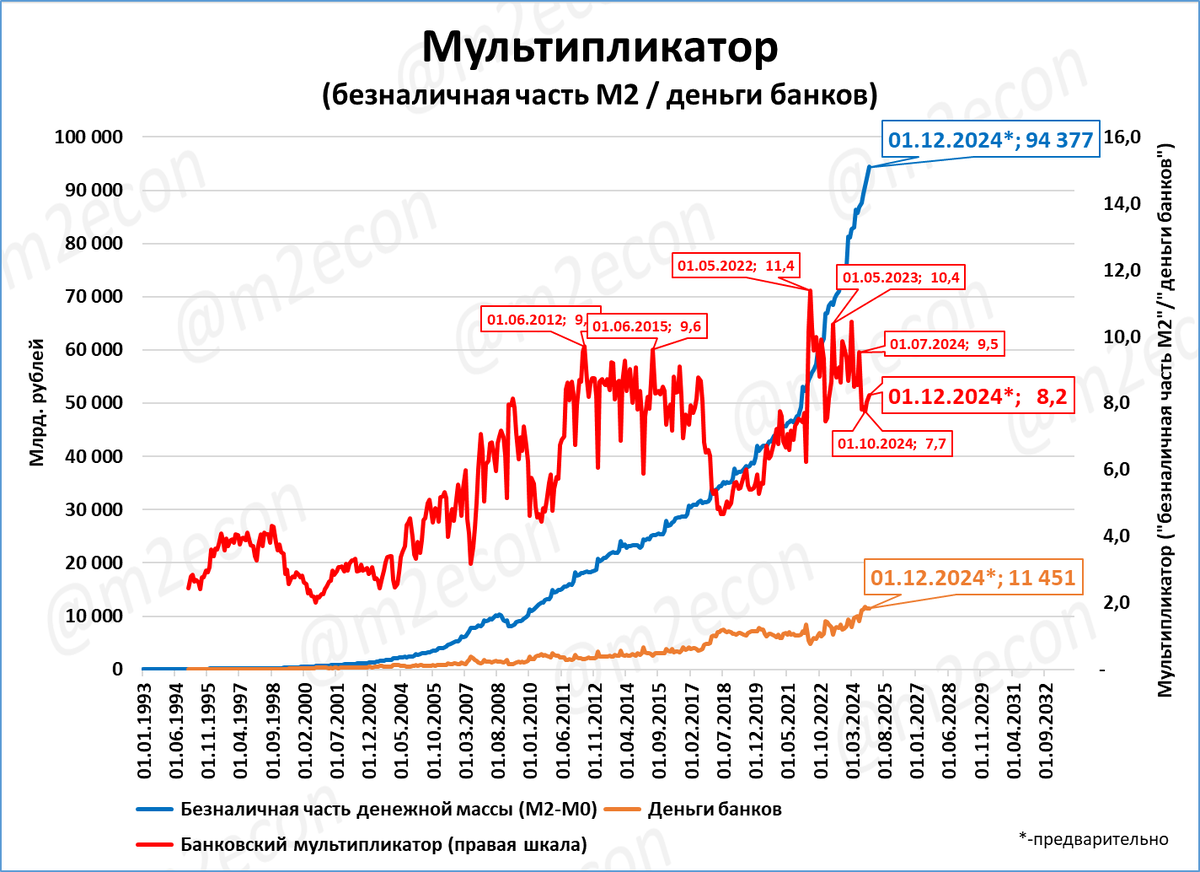 С другой стороны, такая ситуация ведёт к повышению рисков банковской системы из-за роста денежного мультипликатора. О текущем состоянии мультипликаторов см. инфографику далее.