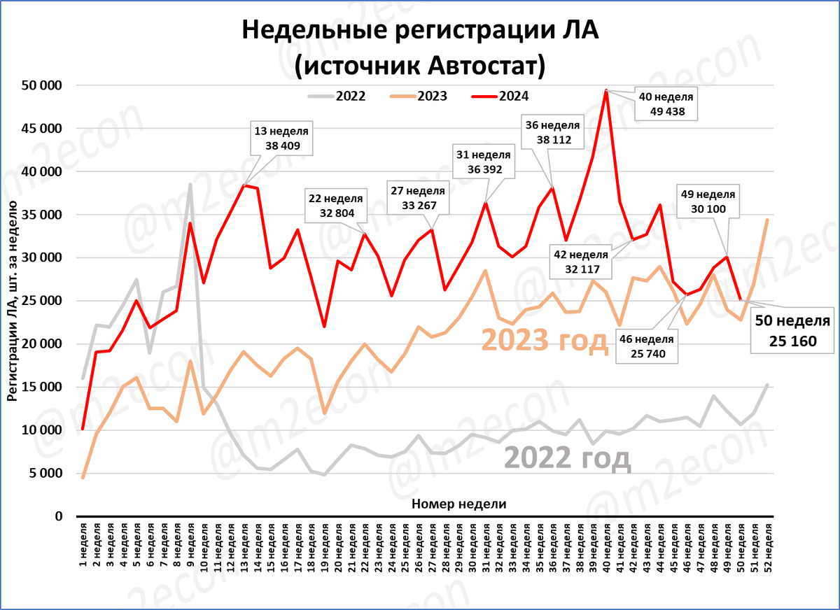 На 50-й неделе было зарегистрировано 25,2 тыс. легковых автомобилей (Автостат).