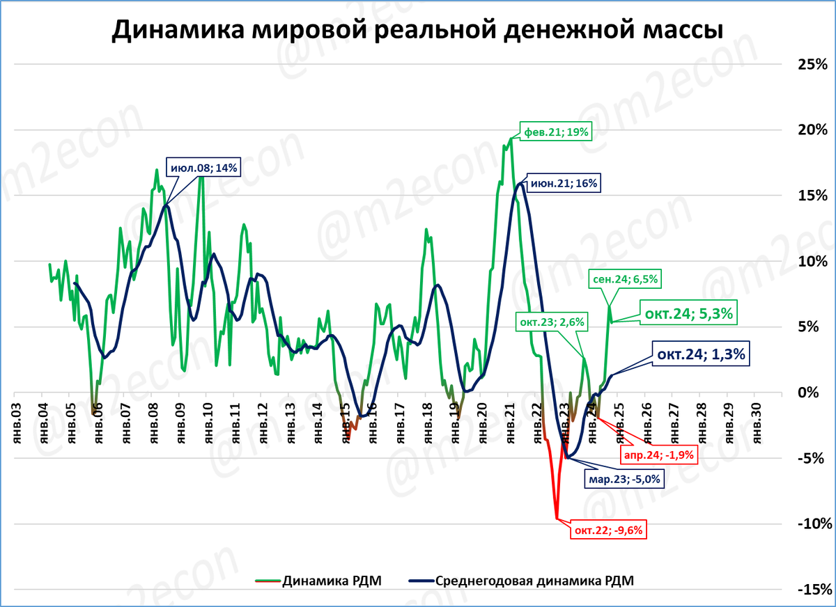 Период падения и медленного роста наблюдался с февраля 2022 года по февраль 2024 года. Сейчас этот период закончился, рост мировой реальной денежной массы ускоряется.