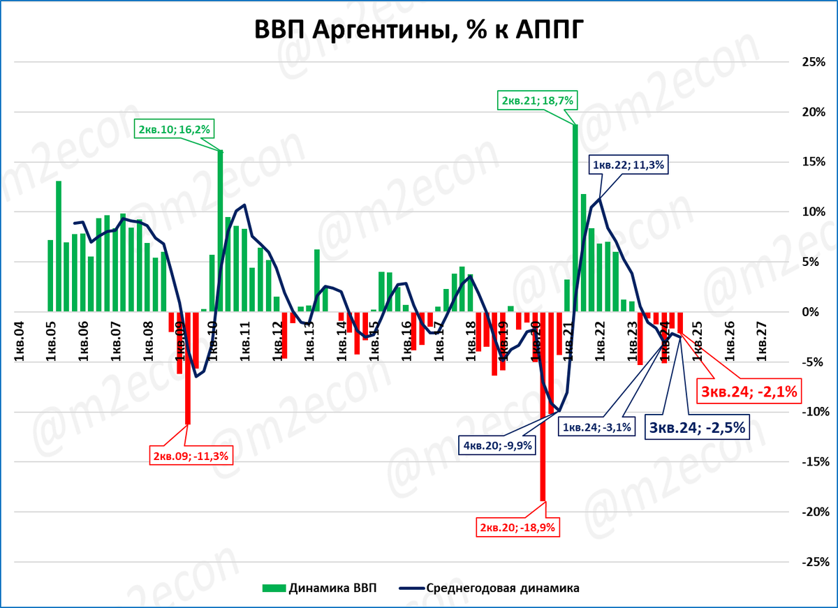 В прошлом обзоре (Макрообзор №50) мы писали о ВВП Аргентины за 2 квартал. 17 декабря вышли новые данные по ВВП в третьем квартале. Падение ВВП в Аргентине в 3 квартале 2024 года составило 2,1%.