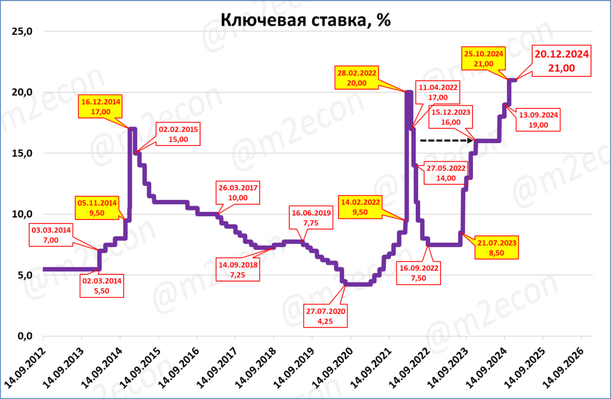 Отметим, что в прошлых эпизодах до максимальных уровней ставка поднималась практически сразу после преодоления уровня 10% (декабрь 2014, февраль 2022).