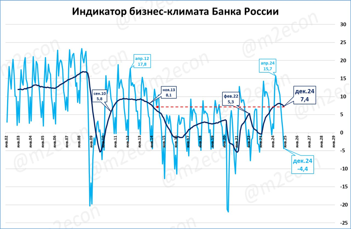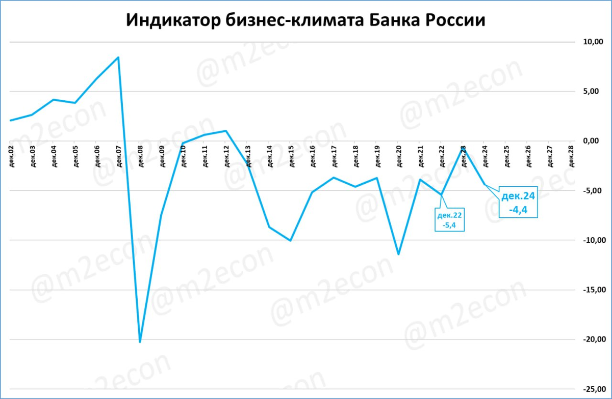 В декабре индикатор бизнес-климата Банк России составил -4,4 пункта: на этот раз нынешний декабрь хуже прошлогоднего.