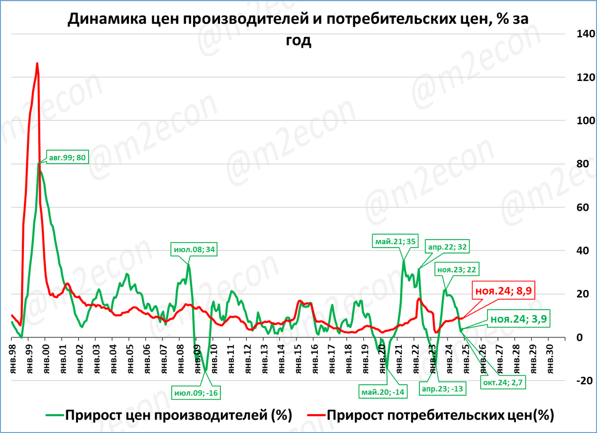 Цены производителей в ноябре (3,9% годовых) серьёзно отстают от роста потребительских цен (8,9% годовых). Это негативный сигнал – экономика замедляется.