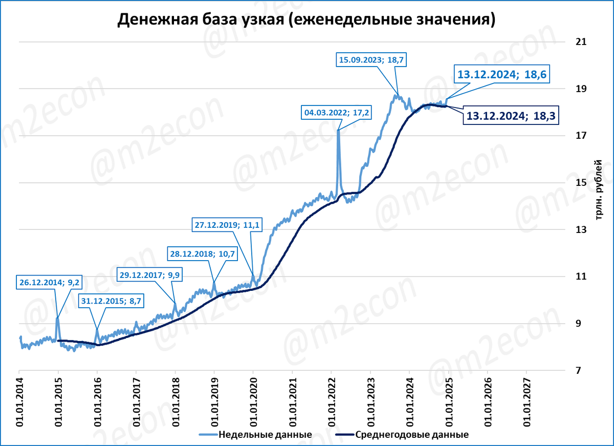 Узкая денежная база (УДБ) уже больше года колеблется в диапазоне 18-19 трлн рублей и не растёт.