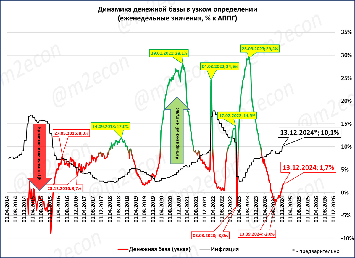 С учётом инфляции, которая превышает 10%, в реальном выражении узкая денежная база сжимается.