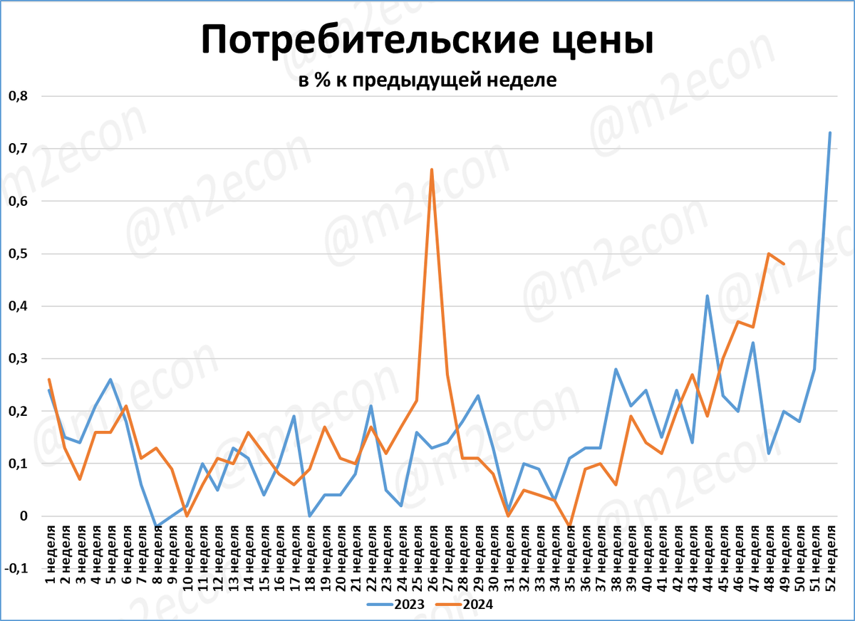 Рост цен за 50-ю неделю (оранжевая линия, конец) по-прежнему выше, чем за аналогичную неделю прошлого года.