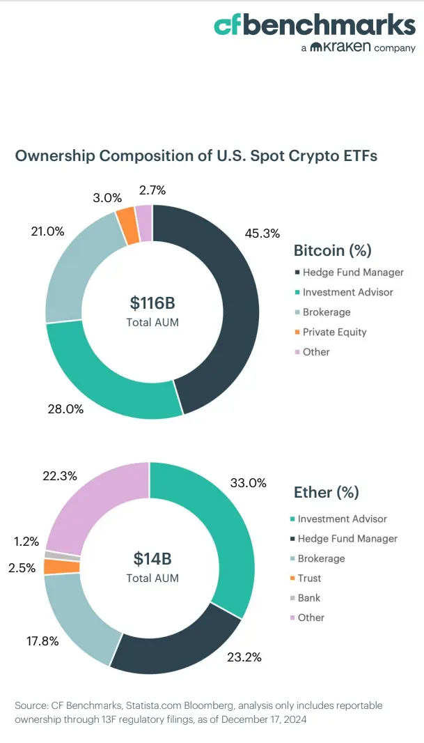 Основной интерес исходил от управляющих хедж-фондов, которым на текущий момент принадлежит около 45,3% в различных криптопродуктах. Инвестиционные консультанты — посредники в розничном и высокодоходном капитале — занимают второе место с 28%.